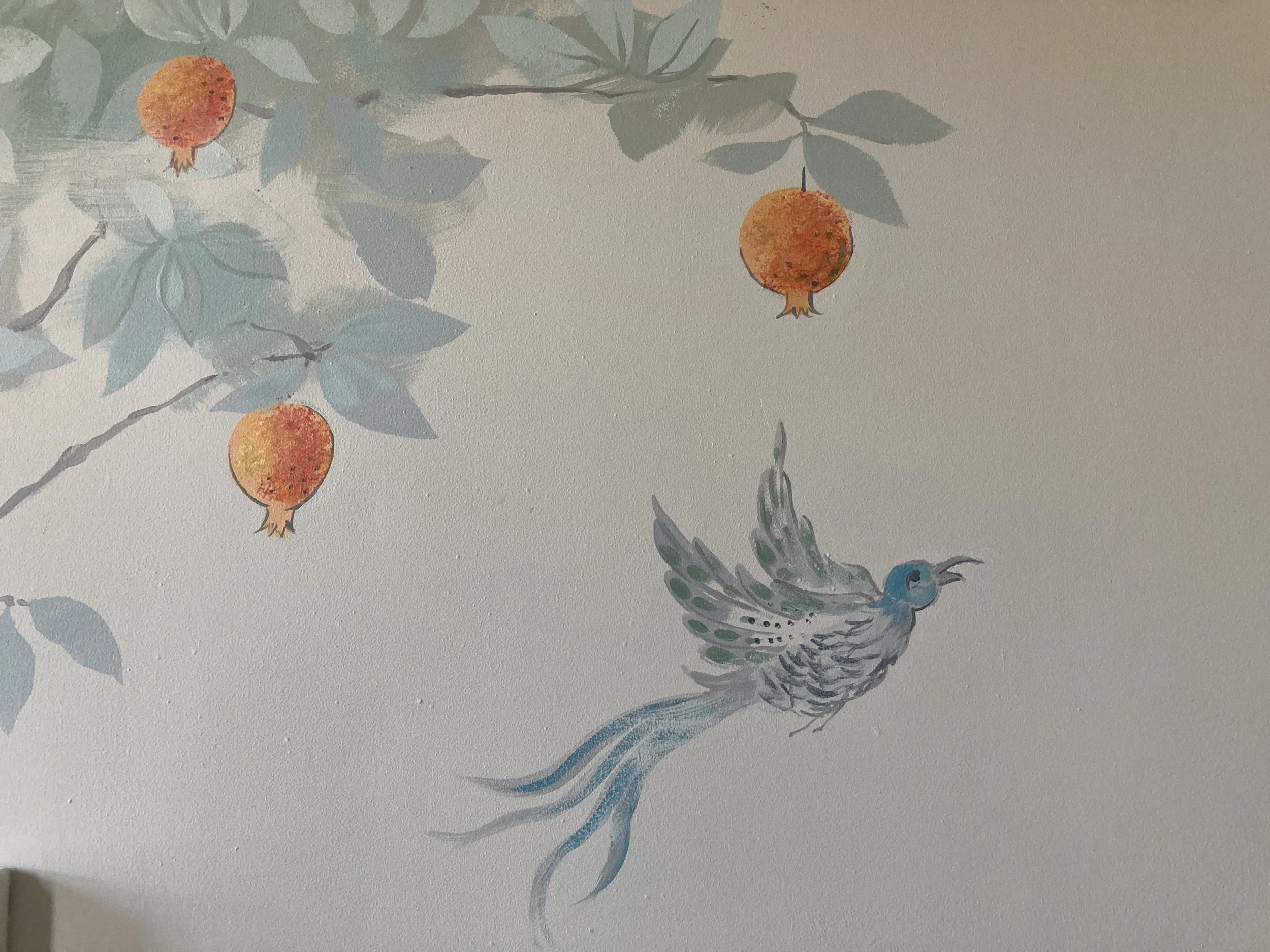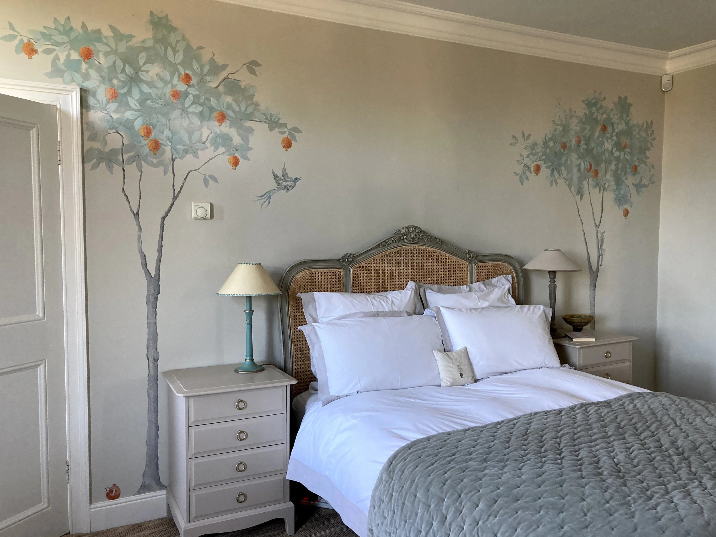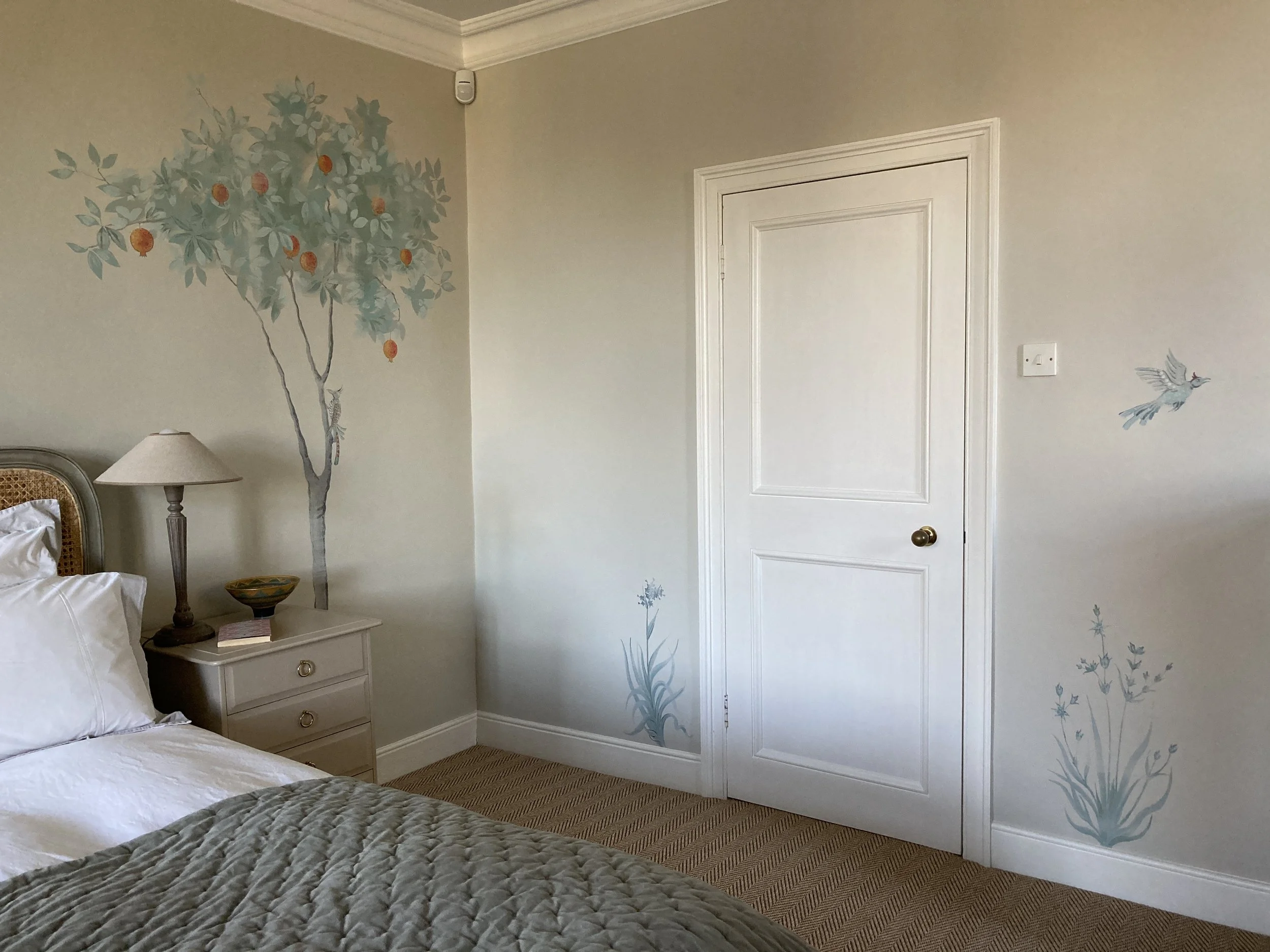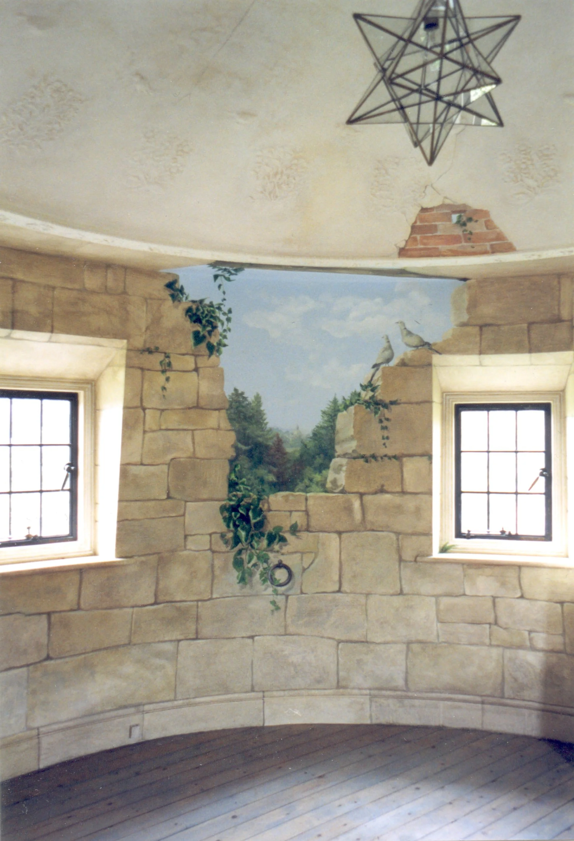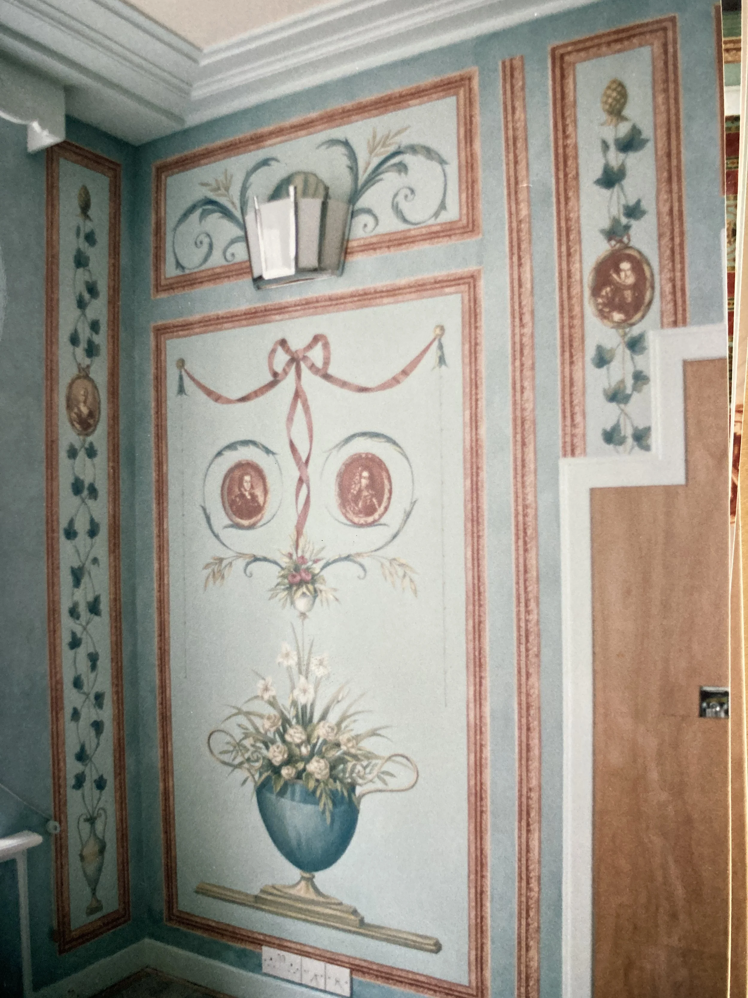 Trompe l’oeil- a hand painted window for an exterior blank wall. Dormansland, Surrey Before Detail Examples of Further Original, Hand-Painted Murals and Friezes. Library Wall, Hand-painted mural. Sunbury, London.‘painted to suggest an imaginary and romantic landscape inspired by medieval Greece.’ Hand Painted canvas blinds for a conservatory, private house. Midlands. Child’s Bedroom and Nursery, ‘…every childhood fable I ever heard’. Drayton Gardens, London Original designs for two stencil and hand painted Friezes in silver or gold leaf. Barnes/ Battersea, London Traditional 18th and 19th century Arabesque work and other original decorations. Fragments from and examples of various trompe l’oeil commissions. Master bedroom with hand painted wall decorations. Discover the beauty of custom artwork